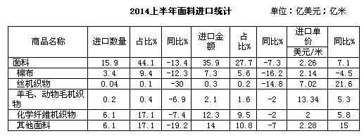 进入2014年以来,我国的外贸形势略显严峻,上半年我国纺织服装进出口贸易虽有增长,但增幅较去年收窄。据中国海关统计,1-6月份,我国纺织品服装进出口总额1454.7亿美元,同比增长4%,其中纺织品服装进口总额129.7亿美元,同比增长2.9%。原料进口方面,今年前6个月纺织原料进口总额下滑27.5%,主要是由于棉花进口量降幅较大,进口羊毛的下降也起到推波助澜的作用。