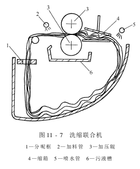 洗缩联合机是洗呢机和缩呢机的有机结合,可同时达到既缩呢又洗呢的目的。结构如图11-7所示。在洗呢机的上、下轧辊前后加装缩幅板和缩箱即成为洗缩联合机。