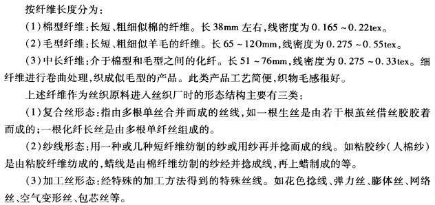 丝织产品花色品种非常丰富,这除了它具有悠久的历史,成熟的工艺之外,和其广泛的应用各种性能的布料材料有很大的关系,现在的丝织品的概念不仅仅是用长丝,已涉及其他各个面料领域,常用丝织物原材料规格如表7—1所示。