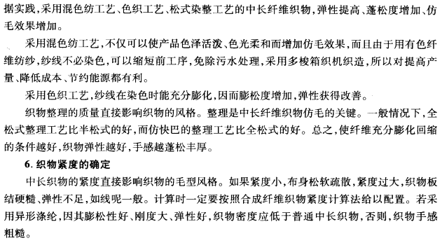 中长纤维织物要求有仿毛感的风格,应选用粗而富有弹性的纤维趋向纺纱线表面的分布。因此,涤腈混纺化纤织物时,聚丙烯腈纤维相对松散,在选用时应比涤纶粗短一些;涤粘混纺化纤织物时,因粘胶纤维不耐磨,弹性差,所以应细长一些。
