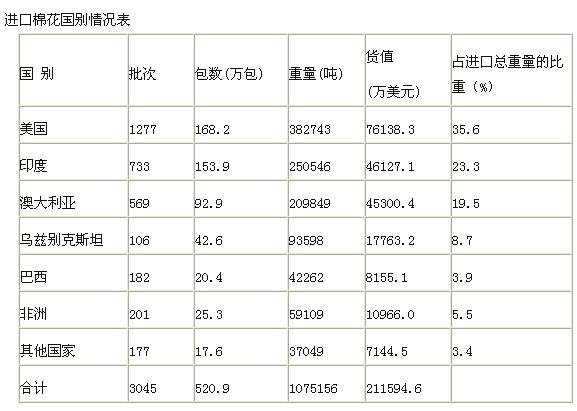 2013年江苏地区进口棉花来自世界各地31个国家和地区,主要有美国、印度、乌兹别克斯坦、澳大利亚、巴西和非洲等,其中以美棉和印度棉为主体,分别占进口的35.6%和23.3%。澳大利亚棉占19.5%,乌兹别克斯坦棉占8.7%,巴西棉占3.93%,非洲棉花占5.50%,其他国家棉占3.45%,具体可参照表1。