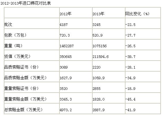1、2013年,江苏检验检疫局共检验进口棉花3245批,520.9万包,1075156吨,货值共计211594.6万美元,经检验对外出具品质索赔证书2220份,品质索赔金额为1059.9万美元,对外出具重量索赔证书2855份,重量索赔金额为1828.0万美元,对外索赔总金额共计为2887.9万美元,占进口总货值的1.37%,为国家和用棉企业挽回了巨大的经济损失。