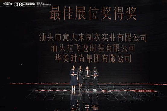 其中,获得3位“佳展位设计奖”的企业汕头市意大来制衣实业有限公司、汕头拉飞逸时装有限公司、华美时尚集团有限公司,在首日的2023CTGE中国·潮国际纺织服装博览会上,赢得了全场专业观众与同行展商的认可。