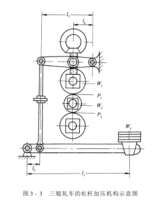 重锤杠杆加压是通过重锤、下杠杆、连杆、上杠杆、升降丝杆而加压于轧辊的。重锤的重量是有限的,通过杠杆后究竟能产生多大的压力呢?我们可根据杠杆原理加以计算。图3-3所示为三辊轧车的杠杆加压机构示意图。