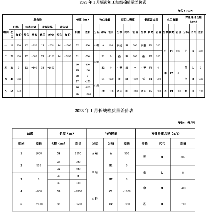 根据《中国棉花协会国产棉质量差价表管理办法》规定,现正式发布2023年1月《锯齿加工细绒棉质量差价表》、《皮辊加工细绒棉质量差价表》和《长绒棉质量差价表》(单位:元/吨)。