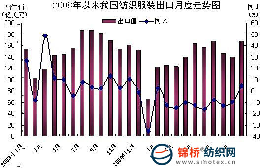 据海关统计,2009年我国出口纺织服装1670亿美元,比上年(下同)下降10.1%。其中服装及衣着附件1071亿美元,下降11%;纺织纱线、织物及制品599亿美元,下降8.5%。其出口主要特点如下: