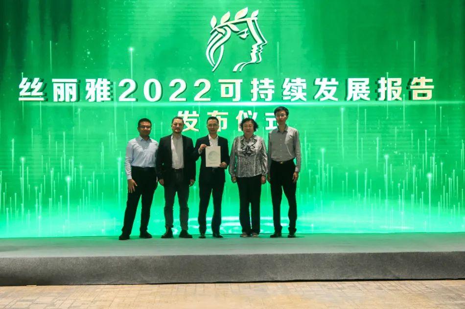图|中国化纤协会原副会长贺燕丽,工信部消费品工业司纺织处四级调研员吴桐,中国纺联社会责任办公室副主任胡柯华,中国化纤协会科技部主任、CV联盟秘书长张子昕,丝丽雅集团副总经理宋伟共同见证了丝丽雅《2022可持续发展报告》的发布。