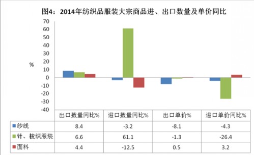 2014年,纺织品出口1121.8亿美元,增长4.9%,服装出口1863.1亿美元,增长5.2%,服装增幅依然超过纺织品,但从全年走势上看,尤其是四季度,服装出口增速开始放缓,后两月还出现负增长,纺织品出口增速正逐步赶上并超过服装。