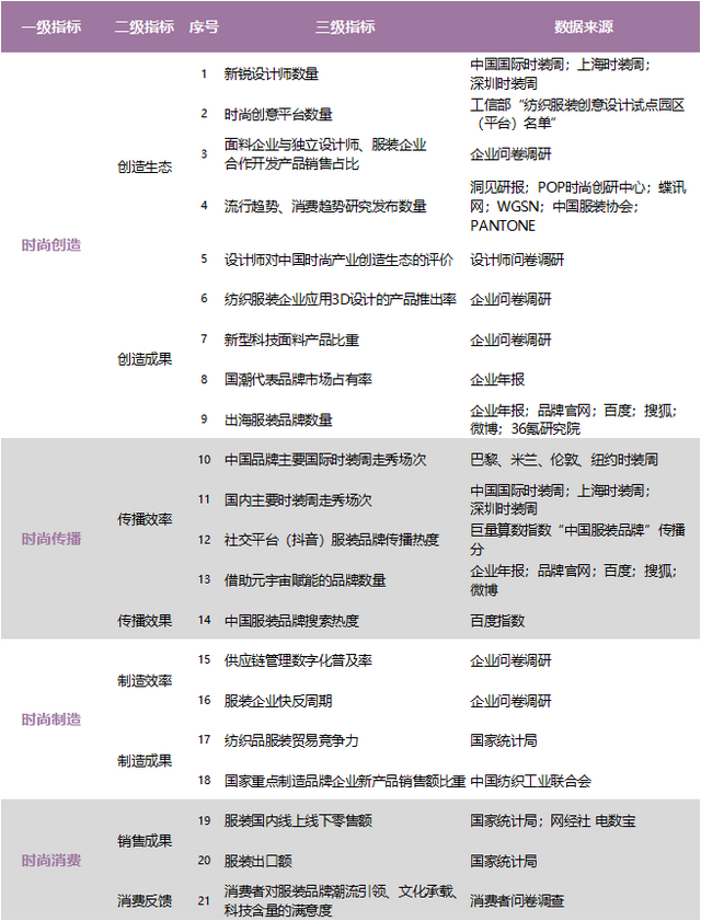 结合时尚的新定义、纺织服装产业的特征以及产业链关键环节综合考虑,终形成由4个一级指标、8个二级指标、21个三级指标构成的中国时尚指数(产业)评估体系。