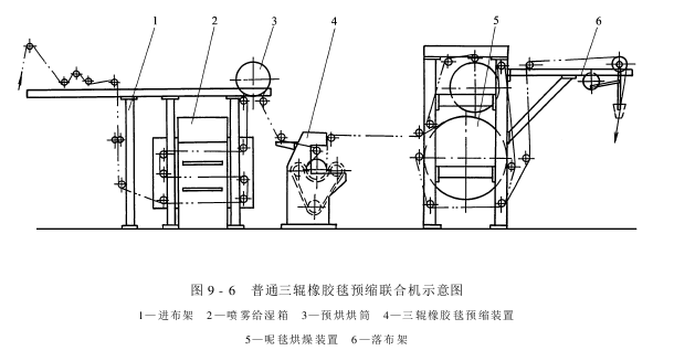 (3)一般三辊橡胶毯预缩联合机:结构如图9-6所示。它和布铁链预缩联合机相比,只是少了一个短布铗链拉幅装置,给湿部分采纳给湿箱给湿,给湿箱内装有喷汽管和喷雾管,织物可双面喷雾给湿,也能喷雾和蒸汽加热同时进行,以提高织物的渗透给湿率。