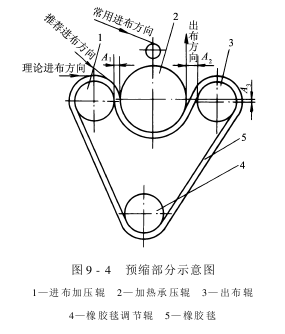 (1)简式三辊橡胶毯预缩机:如图9-3所示,它由进出布装置、给湿装置及三辊橡胶毯预缩装置组成。其核心机构是三辊橡胶毯预缩装置,如图9-4所示,它由橡胶毯、加热承压辊、加压导辊及橡胶毯调节装置等组成,承压辊用蒸汽加热,给湿采纳水管喷雾给湿。