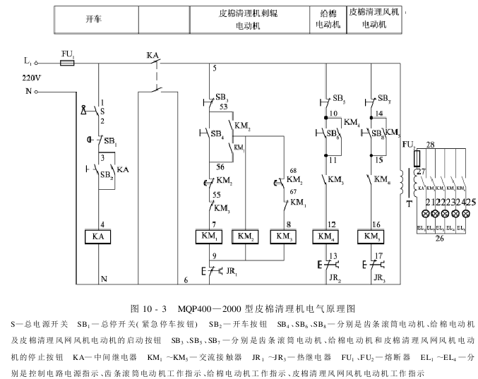 锯齿式皮棉清理机的电气操纵系统因机型不同而有较大的差异,以下仅以MQP400—2000型为例,介绍皮棉清理机的电气操纵系统。