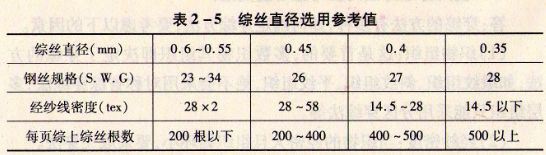 答:综丝的直径有多种,用综时如何选择综丝的直径,一般可根据经纱的特数及每片综页上综丝数的多少来进行。其选用的参考值如表2-5所示。
