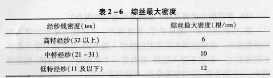 每片综页上综丝数不能过多,如过多将给生产造成困难,综丝的大密度值和经纺纱线密度相关,表2-6所示为综丝大密度值,可作参考。