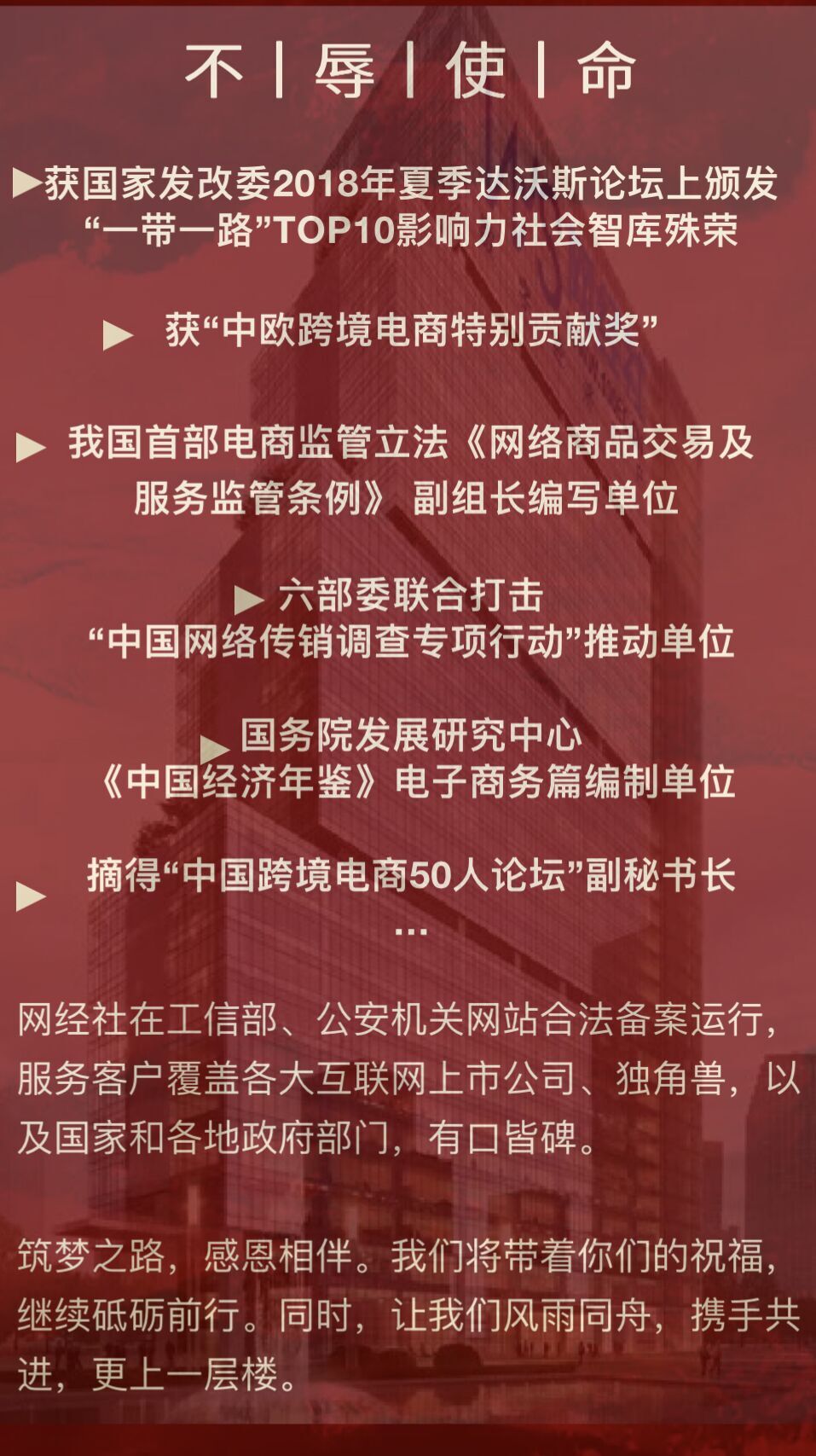 十余年的奋进,也让网经社获得政府、企业、机构、高校等多方的认可。这些年来,我们分别摘得了有关部委在2018年夏季达沃斯论坛上颁发的我国“一带一路”TOP10影响力社会智库、“中欧跨境电商特别贡献奖”、“中国跨境电商50人论坛”副秘书长等殊荣。