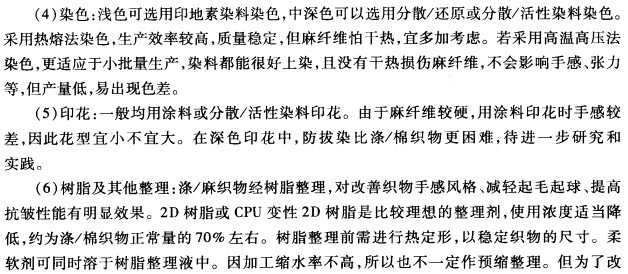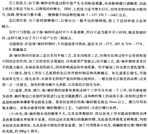 (1)混纺化纤织物比:涤麻混纺化纤织物细特单纱织物以内销为主,考虑到国内消费特点和消费水平,织物应该挺括,不易起皱,布面较细洁,所以涤纶的混纺化纤织物比高于苎麻。一般,涤纶的混纺化纤织物比为55%~70%,苎麻的混纺化纤织物比为30%~45%。