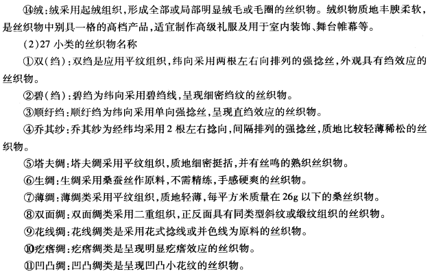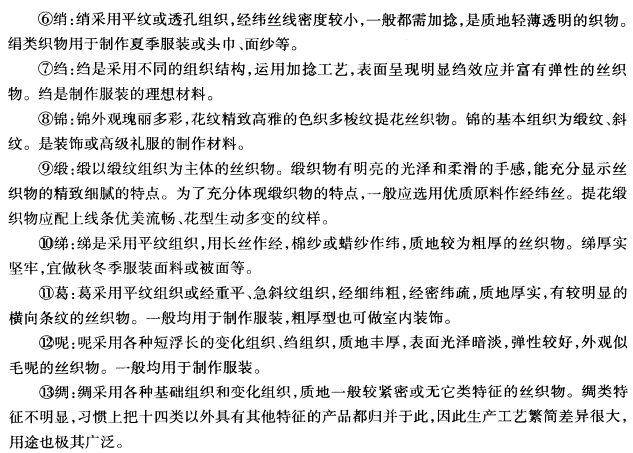 织物的组织结构、整理工艺、使用原材料以及质地和外观形态,并结合它们的用途。在划分大类时还应照顾到我国古代传统的习惯分法。