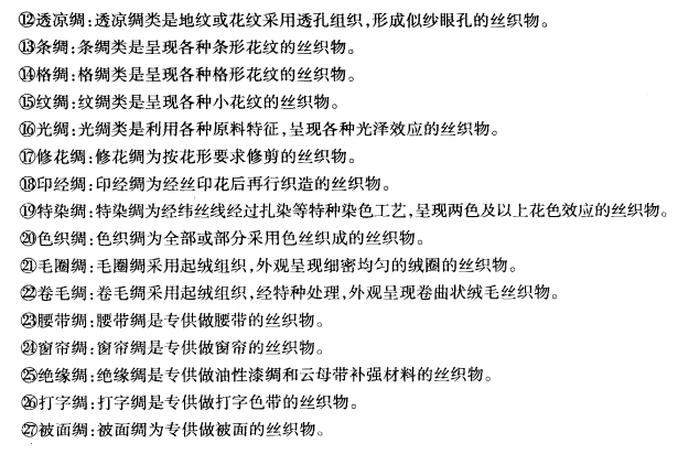 ④绢:绢以平纹或变化平纹为主体,平坦挺括的色织或色织再会染的丝织物。质地细洁,可用于制作工作装。
