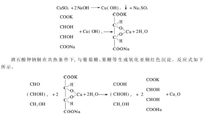 斐林氏液是一种氧化剂,分A液和B液。A液中含有硫酸铜和次甲基蓝;B液中含有酒石酸钾钠和黄血盐。在碱性溶液中,硫酸铜和氢氧化钠作用,生成天蓝色的氢氧化铜沉淀后,马上和酒石酸钾钠起反应,生成深蓝色的氧化铜和酒石酸钾钠的络合物———酒石酸钾钠铜,反应式如下式所示。