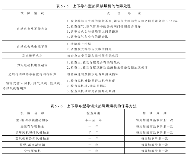 上下导布型导辊式热风烘燥机的故障处理和保养方法分别列于表5-5和表5-6中。