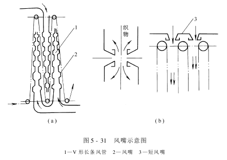 (1)上下导布型导辊式热风烘燥机:如图5-30所示,它由进布架(包含超喂装置)、加热室、风道、烘房、落布装置(包含冷却装置)、传动及自动操纵系统等部分组成。加热室在进出布端各有一个,即前加热室和后加热室。各室内有蒸汽加热器(即散热器)、煤气加热器、轴流循环风机等。经加热后的热空气被循环风机吸入增压后送入风道,经风嘴喷出,以提高织物的温度。烘房的前端装有V形长条风管,上有风嘴数十只,其吹出的热风和织物平面垂直,两面对吹,安装在上二下三导辊间,见图5-31(a)。接着,在烘房内的上下导辊间安装短风嘴数十只,热风喷向织物间,和织物平行流动,见图5-31(b),流速随流程的加大而迅速降低,烘燥效率较低。