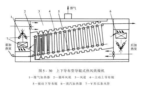 上下导布型导辊式热风烘燥机的特点是结构简单,容布量大,织物受热基本均匀,上下风道和各只风嘴均可单独调节风量和风速,使用操作较方便。其缺点是前后两加热室占地面积较大,进布端几只导辊在运行过程中临时清洁不便,热效率较低,织物纬向收缩时,门幅也不易操纵。为预防织物起皱,上下导辊的中心距一般不超过2m。