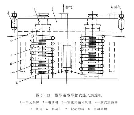 (3)横导布型导辊式烘燥机:如图5-33所示。由于织物在导辊间横穿运行,热空气自横风道经风嘴垂直喷向织物两面,再沿织物经向流动,烘燥效率较高,喷风均匀,占地面积也较小。