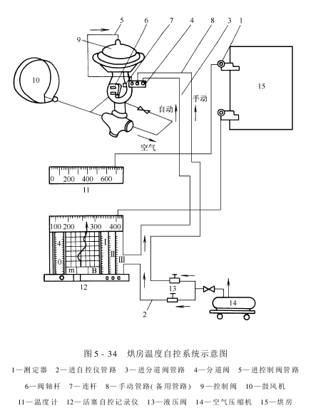 烘燥机的自动操纵系统有空气自动操纵、煤气自动调节和烘房温度自动操纵等。图5-34为烘房温度自控系统示意图。烘房温度可在活塞式自控记录仪调节到所需要的范围。当烘房内的温度超过或低于规定温度时,自动调节系统便能自动调节温差,借助烘房内的温差来操纵空气量的大小和燃气量的大小。