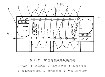 (2)W型导辊式热风烘燥机:如图5-32所示。由于导辊横向间距拉开,上下中心距缩短,织物在烘房内呈W形运行,织物间均安装V形风道,热风垂直喷向织物表面。因此,喷风均匀,烘燥速率有所提高,且便于操作和清洁工作;但容布量较少,占地面积较大。
