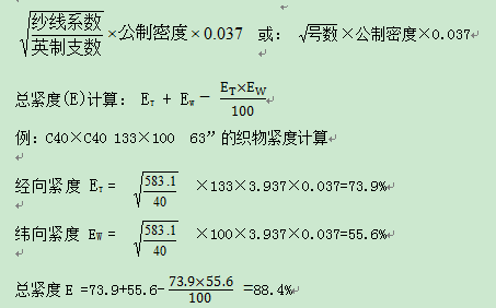 织物的覆盖系数或织物的紧密程度,紧度小,纺纱线间有空隙;紧度大,纺纱线间间隙小,而且有叠加现象出现。紧度单位:%经向紧度(ET)或纬向紧度(EW)计算: