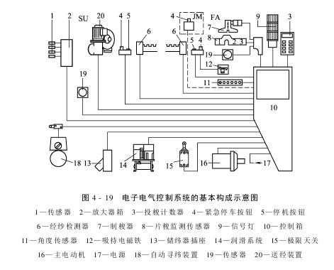 片梭织机的电子电气操纵系统的基本构成示意图如图4-19所示,主要有传感器1,放大器箱2,投梭计数器3,紧急停车按钮4,停机按钮5,经纱检测器6,电子操纵制梭器7,片梭监测传感器8,信号灯9,操纵箱10,角度传感器11,吸持电磁铁12,储纬器插座13,受操纵的润滑系统14,极限开关15,主电动机16,电源17,自动寻纬装置18,识别机械故障的传感器19,电动机送经装置20等构成。