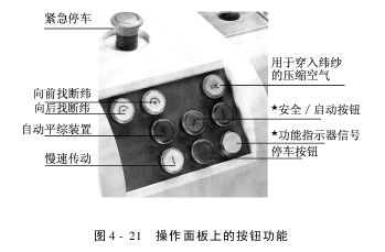 P7300型片梭织机分别在织机的投梭侧、织机中心和接梭侧设有操作面板,操作面板上的按钮功能如图4-21所示。