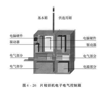 P7300型片梭织机电子电气操纵系统中的的操纵箱具有更高的机动灵敏性,以适应优化织造工艺的要求,采纳了集中操纵全部功能的设计理念,布局整齐、清楚、合理,并引进“源头直达目标”的新型接线理念。增加了对横向交叉功能的支持,自动校正纬纱探测器,自动优化了片梭制动功能,扩展了数据统计功能。P7300型片梭织机电子电气操纵拉杆包含基本箱和供选用箱,其图解如图4-20所示。它主要由电脑硬件,驱动器,电器部分,电源部分等组成。