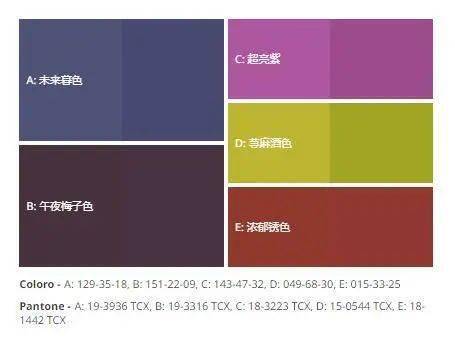 专注于冥静怡神的配色,让心灵得到休憩。介于蓝色和紫色之间的未来暮色是年度色彩,在调色板中占据主位,可搭配上一季的午夜梅子色。