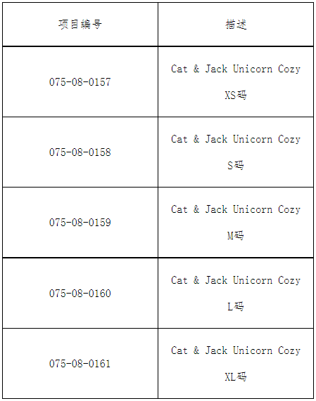 此次召回产品为儿童睡衣套装。产品为两件式长袖上衣和裤子套装,采用“UnicornCozy”图案,品牌为“Cat&Jack”。睡衣上衣为黑色,饰有象牙独角兽和象牙星星,上面用金属金字印有“DreamAway”字样。睡衣裤子为象牙色,饰有黑色独角兽和黑色星星。产品为100%聚酯纤维制成,尺码为XS,S,M,L和XL号。睡衣上衣和裤子的内缝侧缝标签上都印有产品项目编号,具体信息如下: