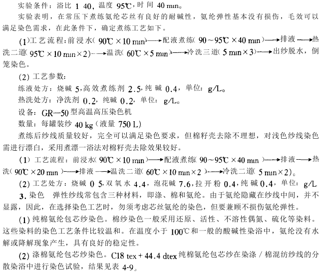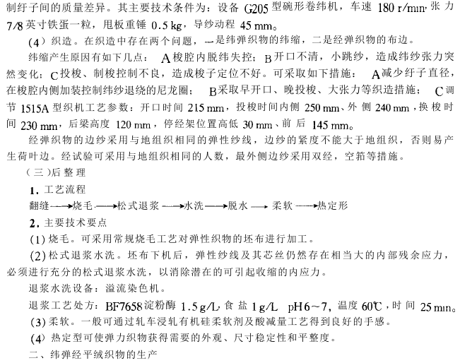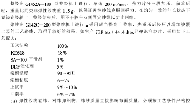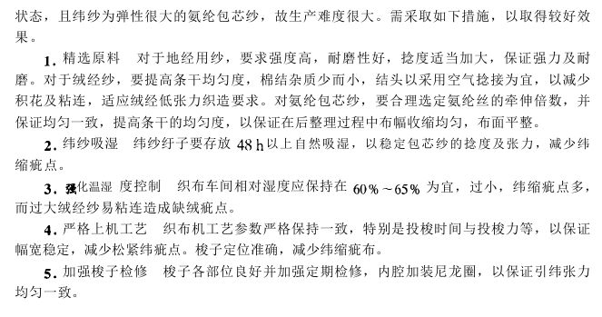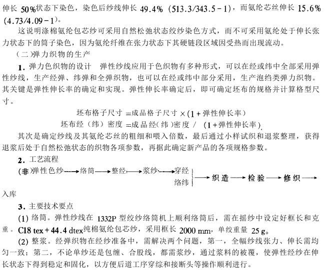 它适合多品种、小批量的色织特点,但整理工艺流程长、成本较高。氨纶包芯纱属本色纺纱线,用于色织生产需进行煮漂上色。