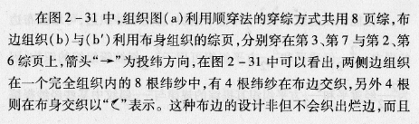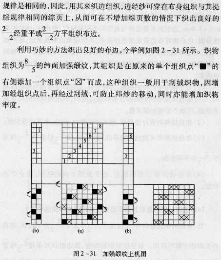 使布边平坦美观,还不增加综页数,因为这种织物其经纬纱密度一般都较大,有意减少边组织的密度可促使布边平坦。这种巧妙的布边组织设计是可取的。