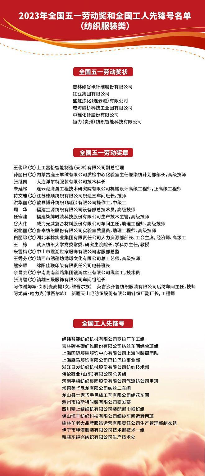 4月27日,全国总工会召开2023年庆祝“五一”国际劳动节暨全国五一劳动奖和全国工人先锋号表彰大会,表彰全国五一劳动奖状207个、全国五一劳动奖章1035个、全国工人先锋号1044个(包括单列名额的奖状7个、奖章44个、先锋号20个)。其中吉林碳谷碳纤维股份有限公司、红豆集团有限公司等纺织企业荣获全国五一劳动奖状,上工富怡智能制造(天津)有限公司副总经理王俊玲等多位纺织人荣获全国五一劳动奖章,浙江日发纺织机械股份有限公司纺纱技术部等纺织集体荣获全国工人先锋号。