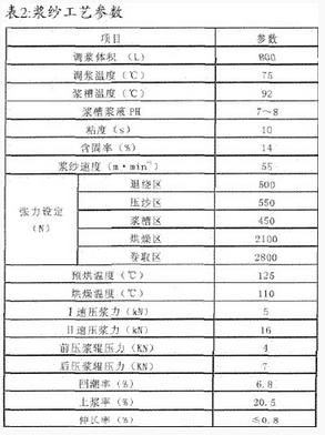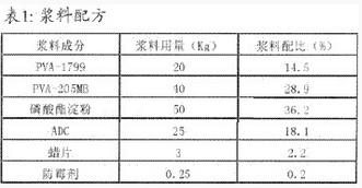 由于本产品为纯棉细特高密织物,总经根数多、经纱密度大,浆纱采纳24只经轴进行并合,织轴有效宽度277.5cm,上浆困难,加之纺纱线较细,强力较低,织造难度系数也大。如果上浆率偏小,或者上浆不匀,则不能很好的趴贴毛羽,简单造成断经,再加上高速喷气织机开口又小,如果开口不清,极易造成阻纬,导致产生疵布。因此,此品种上浆时既要有较好的浸透以适当增强,又要有良好的被覆以贴趴毛羽,并形成柔韧完滑的浆膜以增加耐磨,以保证开口清楚,适应喷气织机高速、大张力的织造要求。本着既能达到上浆质量、满足织造及成品要求,又完量少用PVA、减少环境污染,同时兼顾浆纱成本的原则。采纳的浆料配方如表1所示: