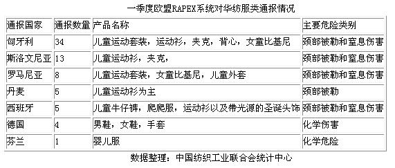今年一季度我国对欧盟服装出口形势不乐观,与此同时,欧盟RAPEX系统对我国出口服装的召回数量却在迅猛增长,此趋势应引起出口企业的高度重视。