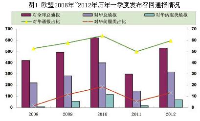 从图1数据上我们可看出,2008年至2012年历年一季度数据相比,欧盟RAPEX系统对我国发出产品召回通报的数量占比始终在50%以上,对我国纺织服装类产品的通报也有回升之势。今年一季度发出的通报数量已经大大超过去年,甚至超过了金融危机爆发的2008、2009年,直逼历史上通报发出频繁的2010年。从图中可以看出,今年以来欧盟对全球发出召回通报数量整体上扬,针对我国纺织服装类产品也随之“水涨船高”。