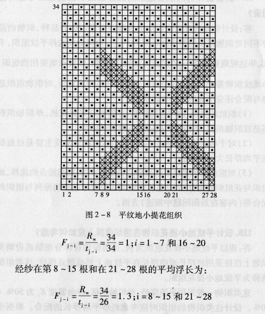 为此在图2-8的组织图的组织循环内,得知仅仅具有经纱平均浮长为1和1.3两种配合,因此,该组织图(图2-8)符合平纹地小提花织物的牛产要求.