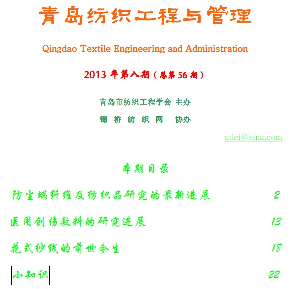 由青岛市面料工程学会主办、面料网协办的《青岛布料工程和治理》电子期刊于2009年1月正式创刊。该刊由青岛市面料工程学会秦志强工程师任主编。该刊除以电子邮件形式发送至会员单位外,还在面料网开设特意窗口供业内人士进行扫瞄和查阅。该刊的创办定能为广大面料业技术人员提供1个技术交流平台,为我国面料业技术创新起到积极作用。
