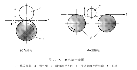 按磨辊的多少可以分为单辊式和多辊式,常用的是多辊式。多辊式一般为8~12根磨毛辊,其分布可分为站式和卧式两种,如图9-25所示。