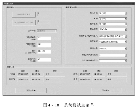 系统测试主菜单(图4-10)可以选择或者输入以下系统测试参数:试验员编号、治理员编号、批号、包号位数。也能重新设置样品计数清零、清空重测样品编号文件。可以选择输入状态参数选项:等级、重测、批样限值、样品废弃、长度单位/短纤维定义、棉花类型、测试结果、颜色/杂质测试次数、长度/强度测试次数。