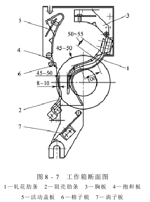 (1)前箱的结构:前箱左右侧壁均由钢板焊接而成,主要部件有拨棉刺辊、阻壳肋条排、导流板。