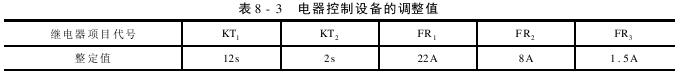 按钮盒和操纵柜内的电气元件出厂前均已连接好,只要按随机所带的有关资料,将按钮盒/操纵柜到全部用电设备及电气元件的导线,按要求接好即可。接好线后,应用兆欧表或万用表检查全部电动机/电气元件和线路,为预防出现断路和短路现象,还应按表8-3将KT(时间继电器)和FR(热继电器)的整定值进行调整。