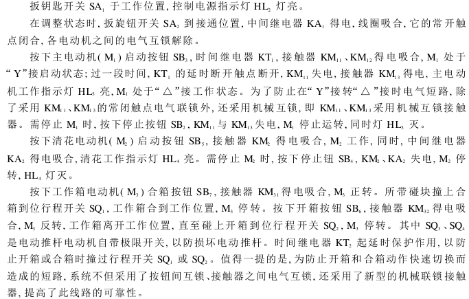 (1)设有状态转换开关。当打到试制状态时,各个电动机可以单独自由启动,若打到工作状态,就必须按肯定的顺序启动。