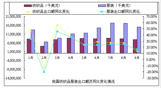 2011年9月,我国出口纺织纱线及织物79.47亿美元,出口服装及衣着附件150.32亿美元,分别比8月下降了4.9%、12%。1~9月,纺织品服装累计出口1861.3亿美元,增长24.2%,其中纺织品出口709亿美元,增长25.9%,服装出口1152.3亿美元,增长23.3%。