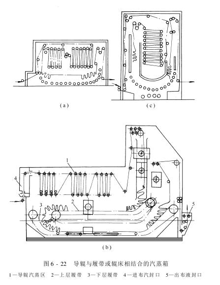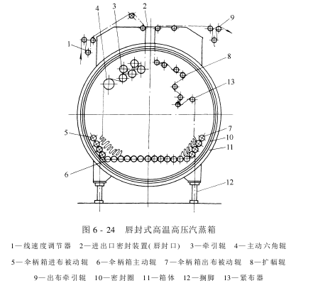 图6-24所示为唇封式高温高压汽蒸箱。织物经唇封口进入卧式圆筒形汽蒸箱后,堆置在主动回转的不锈钢辊组成的辊床(伞柄)上,在高压(196kPa)蒸汽中汽蒸1~4min,导出洗净。它的唇封口结构见图6-25,进机织物和出机织物分别从固定安装的中心支架的两个完滑表面滑过,管形气袋内充入压缩空气后,通过外包聚四氟乙烯唇板,将织物压向中心支架表面,形成密封。